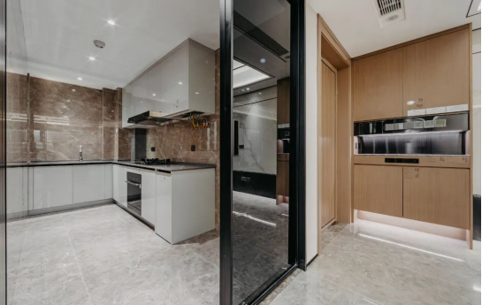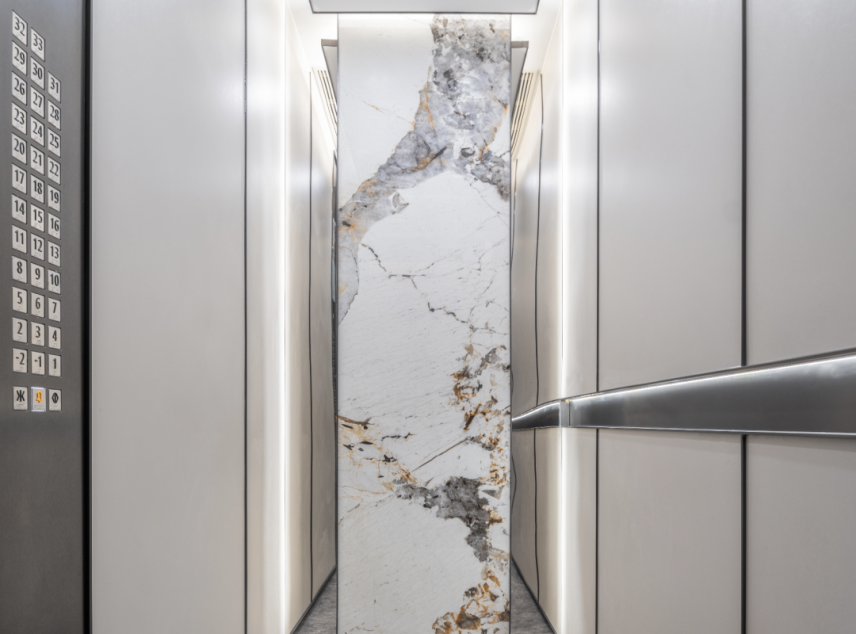 穿越大堂,来到电梯间,只见首层电梯厅的吊顶延续悬浮顶设计,电梯门框采用不锈钢通顶镶嵌,内部装修同样延续大堂,正面点缀岩板,两侧采用的是仿皮的防火板。这样高规格的电梯配置,性价比远超河西5万+的项目!