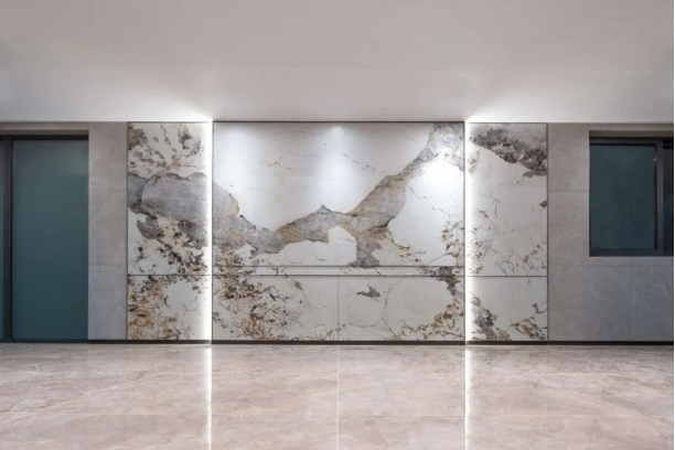 除了外立面的“颜值”外,作为公区重要组织部分的入户大堂也是买房人关注的部分之一。在入户大堂的营造上,颐和四季府以现代美学为基础,采用现在流行的“悬浮顶”设计,景墙臻选潘多拉岩板,搭配金属装饰和灯光设计,质感精致考究。